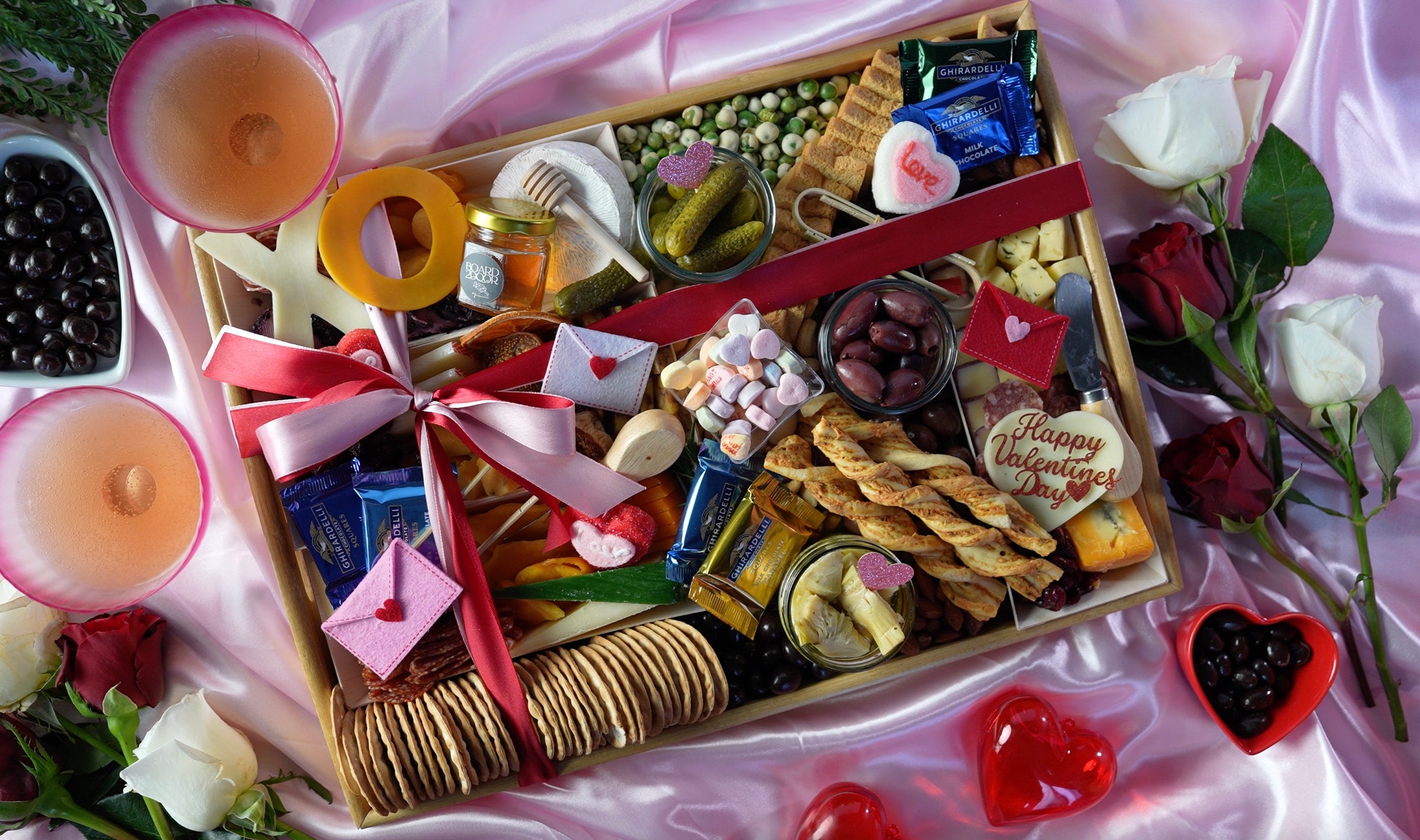 This delightful Valentine’s Day CharCUTErie board features a carefully curated selection of savory and sweet treats, perfect for celebrating with your loved ones. It includes a variety of gourmet cheeses, crackers, dried fruits, pickles, chocolate truffles, and heart-shaped marshmallows, all beautifully arranged to create a festive and thoughtful presentation. The board is delivered fresh with a seal to ensure maximum freshness for 7-10 days when stored in the fridge.